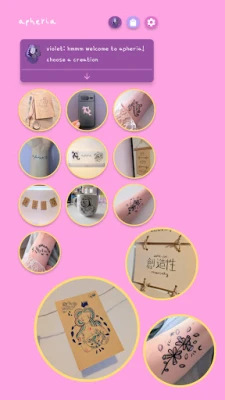 - violet - apheria's resident AI chatbot helper violet adds a touch of magic to the app, providing a constant flow of fresh ideas and inspiration to spark your imagination and guide you on your creative journey.