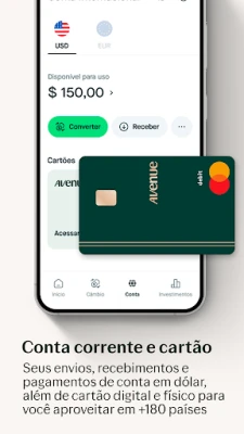 (3) Faça transferências, tenha um cartão internacional aceito em mais de 180 países e preserve seu patrimônio. A conta corrente internacional da Avenue permite gerenciar seu patrimônio em dólar ou euro com praticidade, realizar câmbio e acessar produtos globais sem complicação.