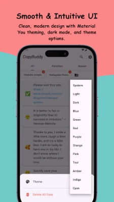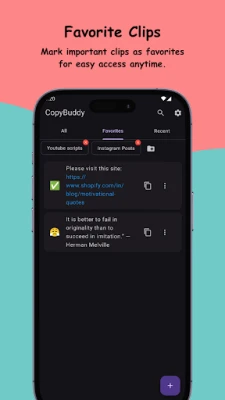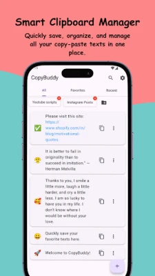 Discover Copy Buddy, it's your best friend for manage everything you copy on your phone. Whether it’s text, a link, a funny quote or an important note, Copy Buddy helps you save, organize and quickly access your clipboard items in a user-friendly app.