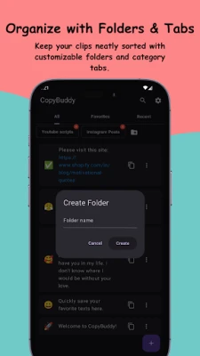 Organize with Folders and Tabs: Whether you prefer to keep things simple or neatly categorized, CopyBuddy lets you create folders and use tabs like "All," "Favorites," and "Recent" to find exactly what you need quickly.