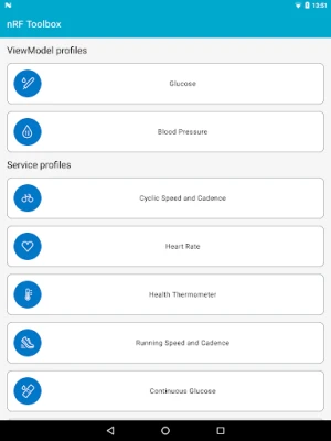 The nRF Toolbox is a container app that stores your Nordic Semiconductor apps for Bluetooth Low Energy in one location.